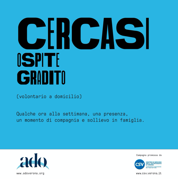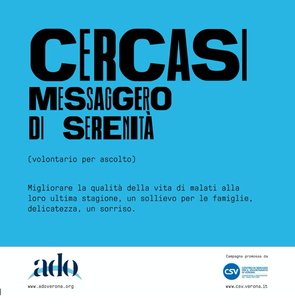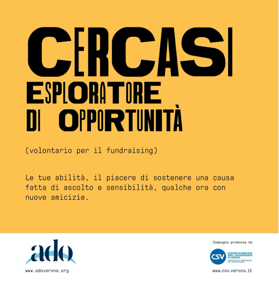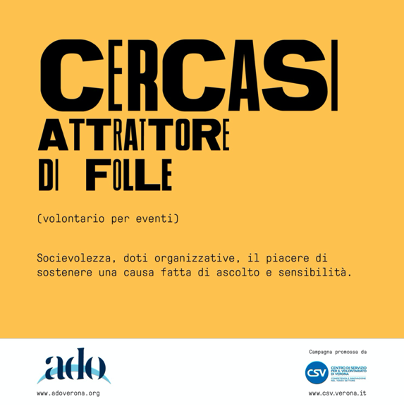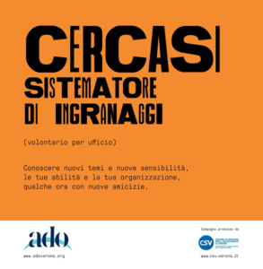 Ado Verona aderisce alla campagna di comunicazione e sensibilizzazione Cercasi Umani. La campagna, promossa da CSV di Verona ODV in collaborazione con il dipartimento di comunicazione e ricerca sociale dell’università La Sapienza di Roma, si propone di dare visibilità ai valori del volontariato e all’impatto sociale dell’azione volontaria, promuove la crescita della cultura della solidarietà e della cittadinanza attiva in particolare tra i giovani, facilita l’incontro degli enti di Terzo settore con i cittadini interessati a svolgere attività di volontariato e con gli enti di natura pubblica o privata che lo vogliono promuovere.